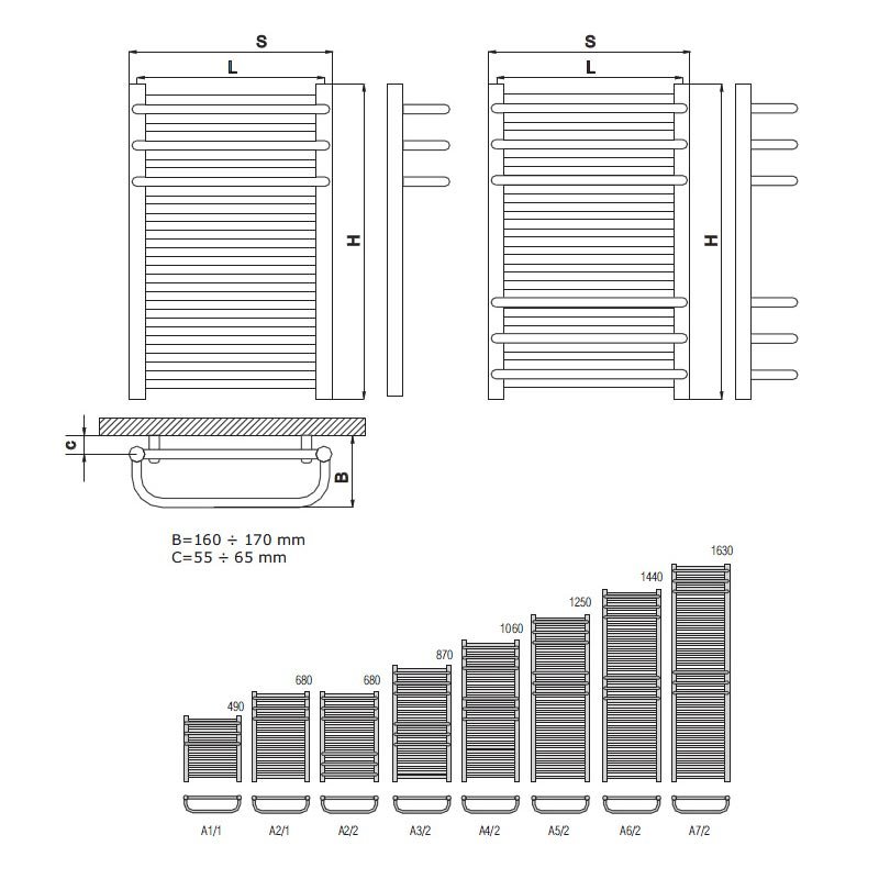 Grzejniki mają cztery króćce przyłączeniowe o średnicy ½”. Każdy grzejnik wyposażony jest w korek, odpowietrznik oraz komplet mocowań. Usytuowanie grzejnika w pomieszczeniu powinno być zgodne z projektem instalacji c.o. Zaleca się mocować grzejnik możliwie nisko z zapewnieniem jego funkcjonalności jako suszarki ale nie mniej niż 100 mm od podłogi.